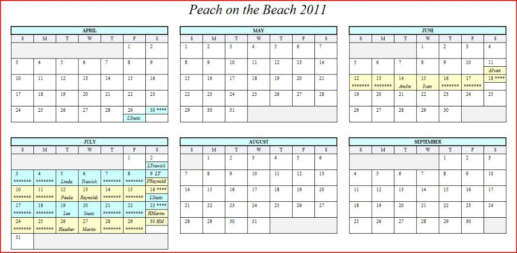 | The availability calendar for Peach on the Beach is below. Notice some days are split. Those days are check-in / Check-out dates. Check-in time is 4 pm or later and check-out time is 10 am or earlier. |